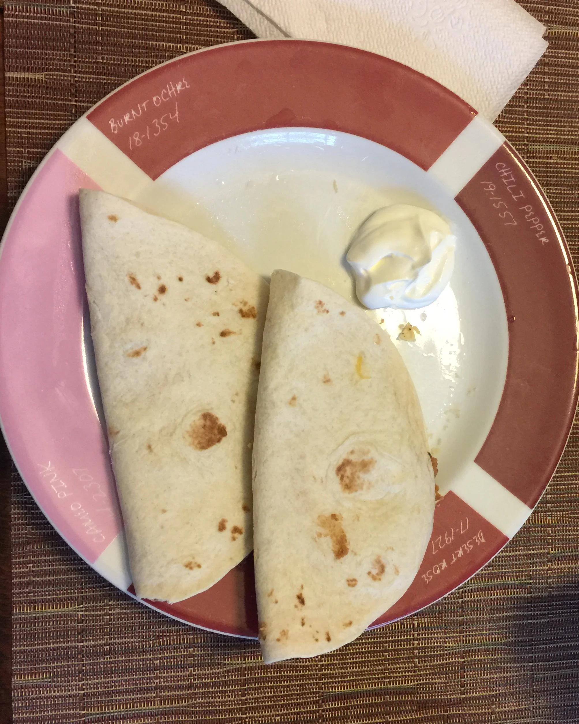 Preheat oven to 300 degrees. Spread beans on 1/2 a tortilla. Sprinkle on cheese. Fold over other 1/2 of tortilla. Place on baking sheet. Bake for 15-minutes. Plate two and serve with sour cream and Guacamole. Makes 4 servings